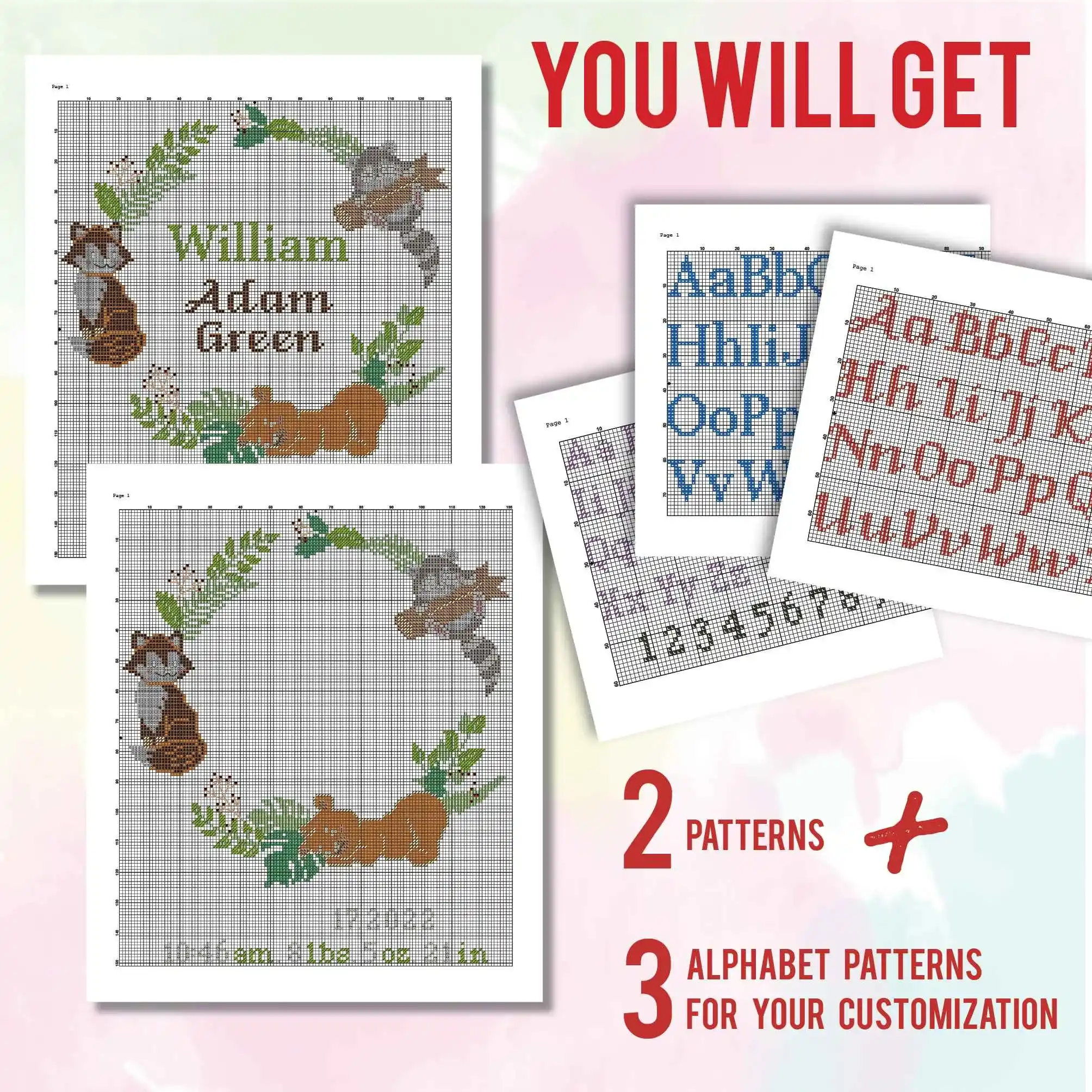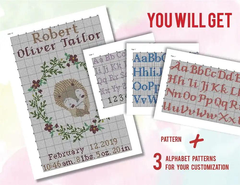 • Squirrel hedgehog Birth announcement cross stitch pattern
