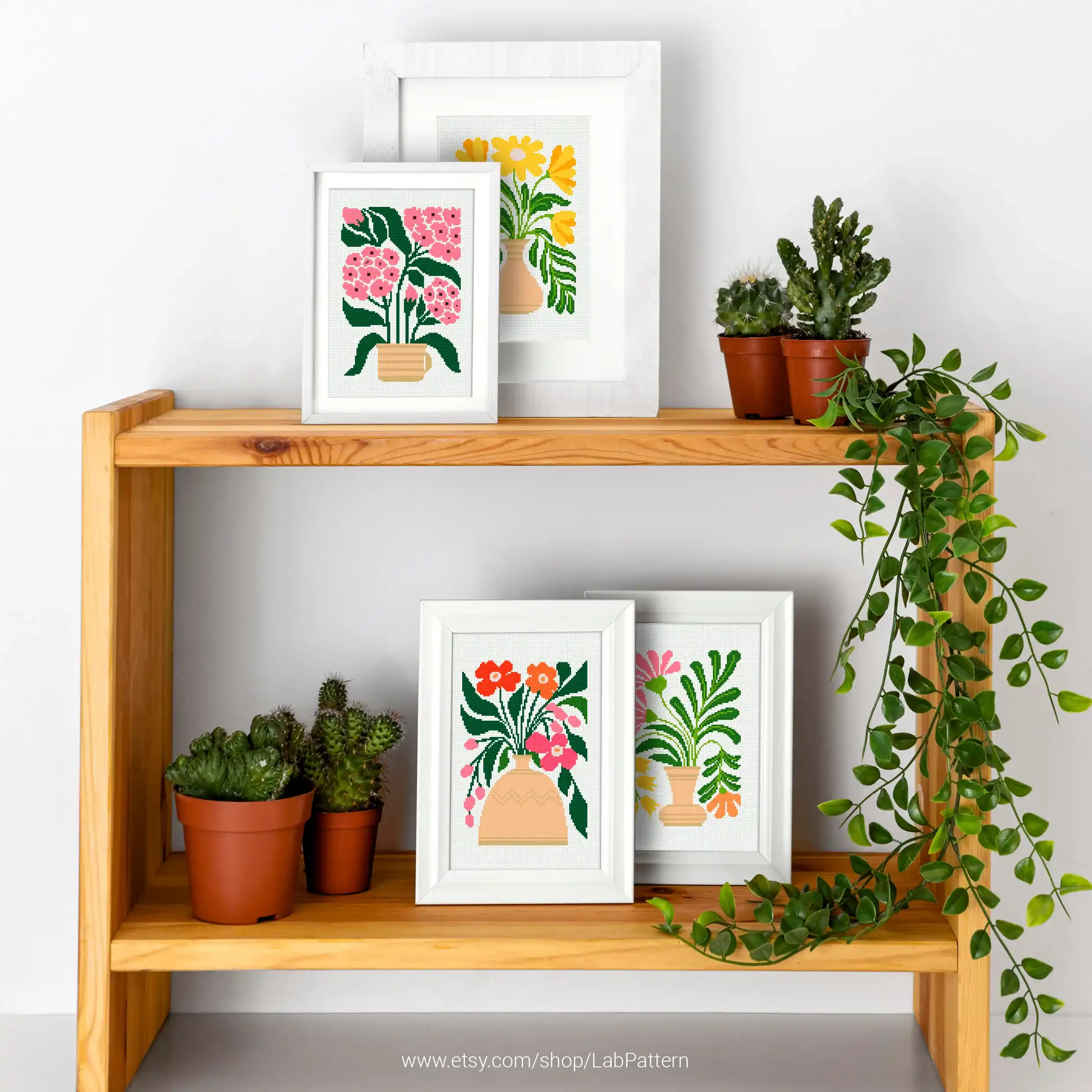 • Bundle of 4 mini contemporary Flowers in pots Cross stitch pattern