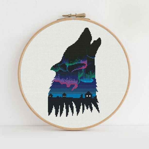 Wolf Silhouette Northern Lights Cross stitch pattern